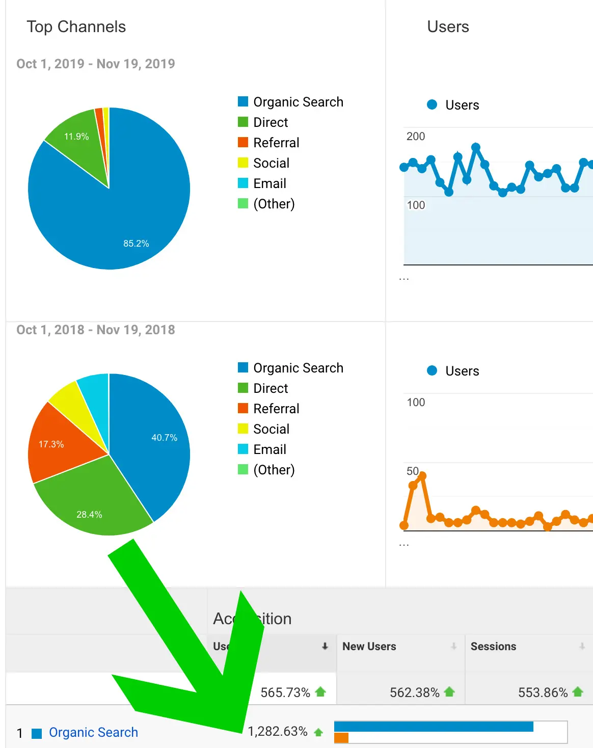 This screenshot is a real client showing that in one year of SEO their traffic went from an average of 10 visitors a day to 150. The biggest chunk (85% of all of their traffic) comes from organic (FREE!) visitors from search engines.